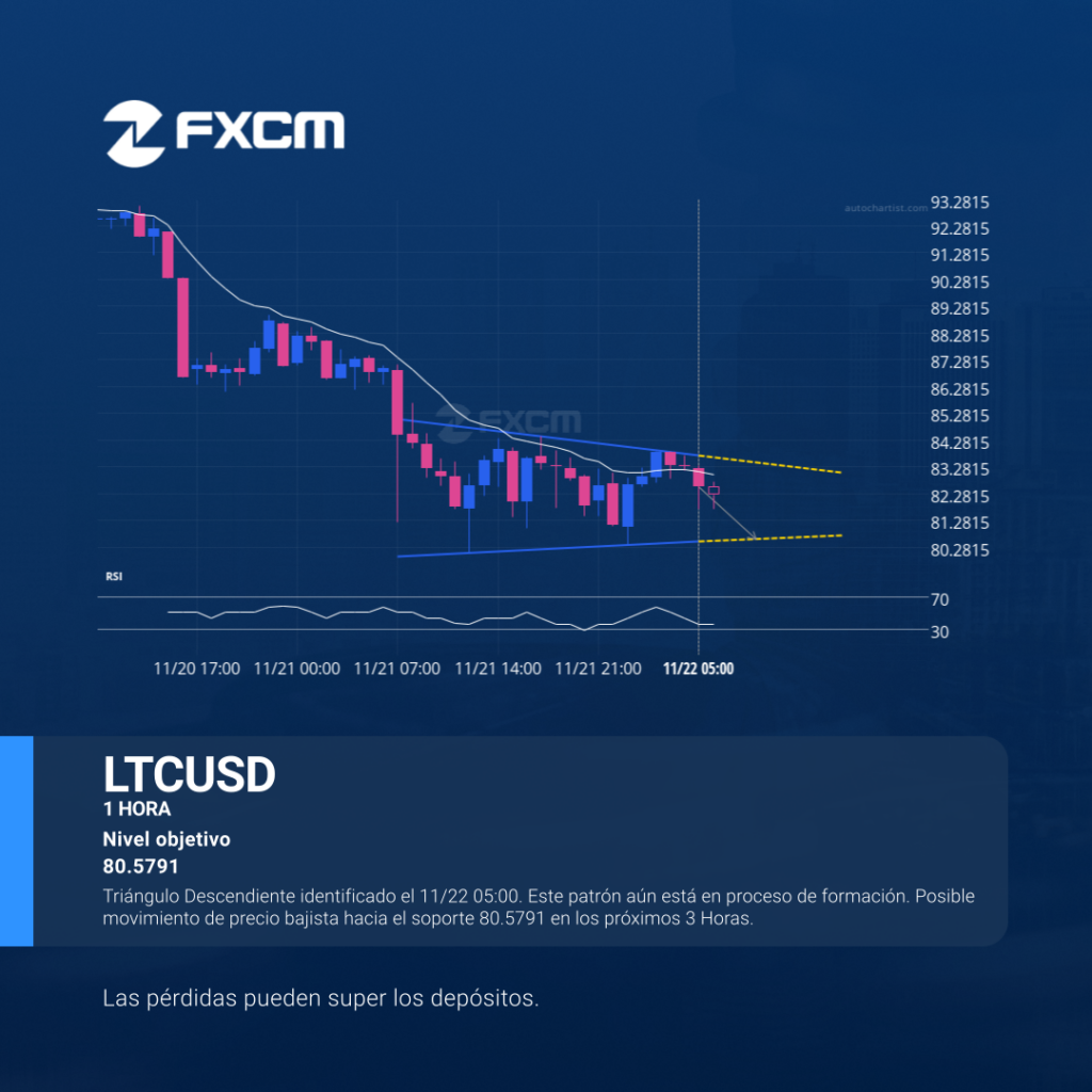 Triángulo Descendiente identificado el 11/22 05:00. Este patrón aún está en proceso de formación. Posible movimiento de precio bajista hacia el soporte 80.5791 en los próximos 3 Horas. El rendimiento pasado no es indicativo de resultados futuros. Las pérdidas pueden exceder los fondos depositados.
