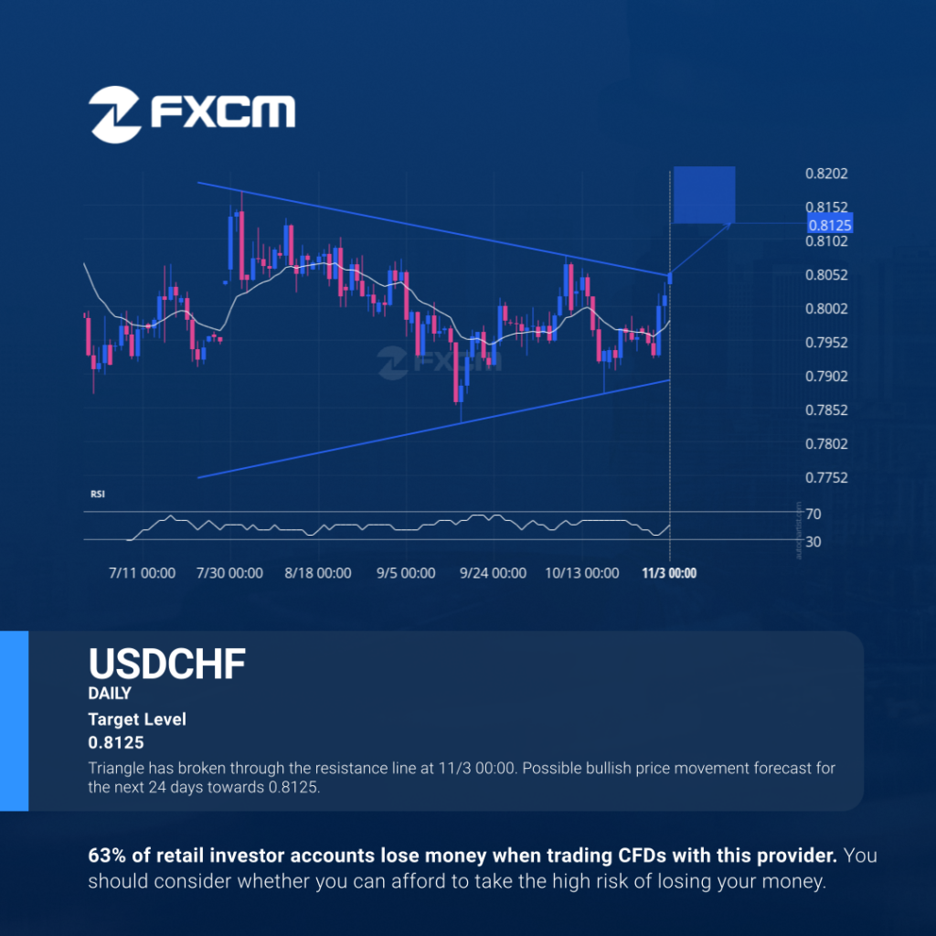Triangle has broken through the resistance line at 11/3 00:00. Possible bullish price movement forecast for the next 24 days towards 0.8125. Past performance is not an indicator of future results. Losses can exceed deposits.