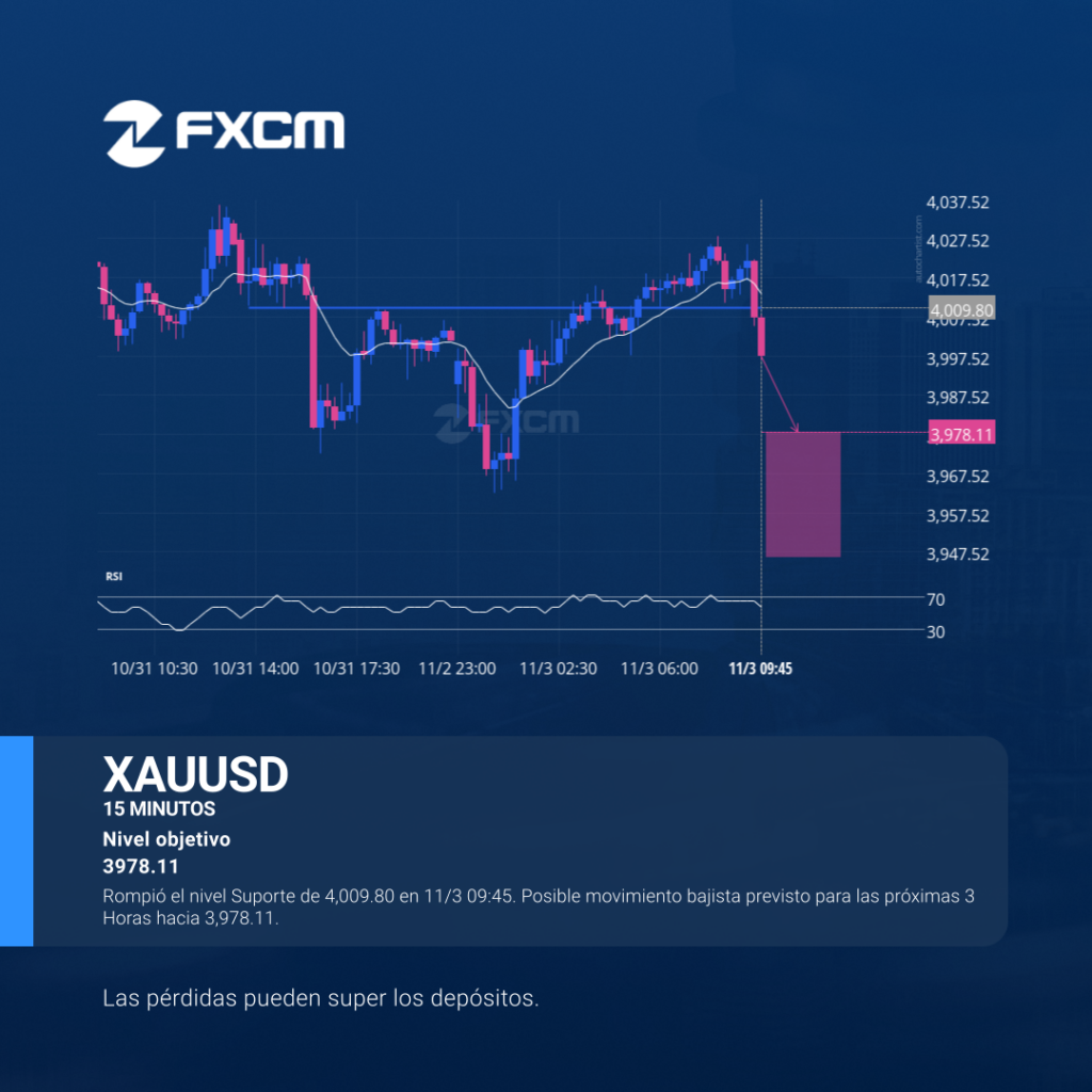 Rompió el nivel Suporte de 4,009.80 en 11/3 09:45. Posible movimiento bajista previsto para las próximas 3 Horas hacia 3,978.11. El rendimiento pasado no es indicativo de resultados futuros. Las pérdidas pueden exceder los fondos depositados.