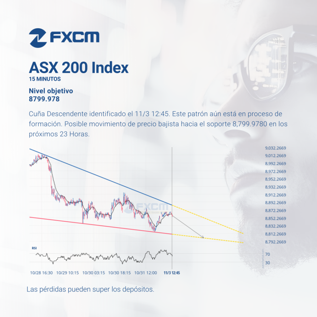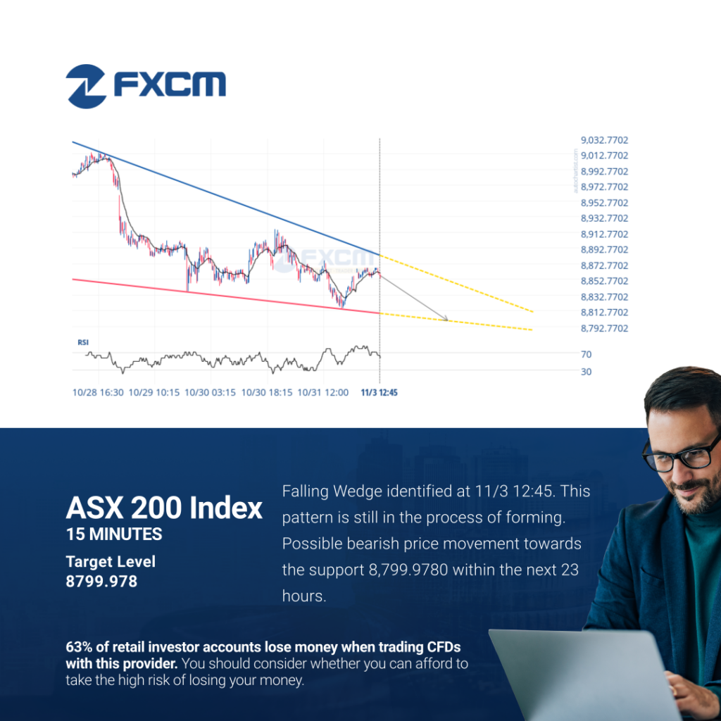 Falling Wedge identified at 11/3 12:45. This pattern is still in the process of forming. Possible bearish price movement towards the support 8,799.9780 within the next 23 hours. Past performance is not an indicator of future results. Losses can exceed deposits.