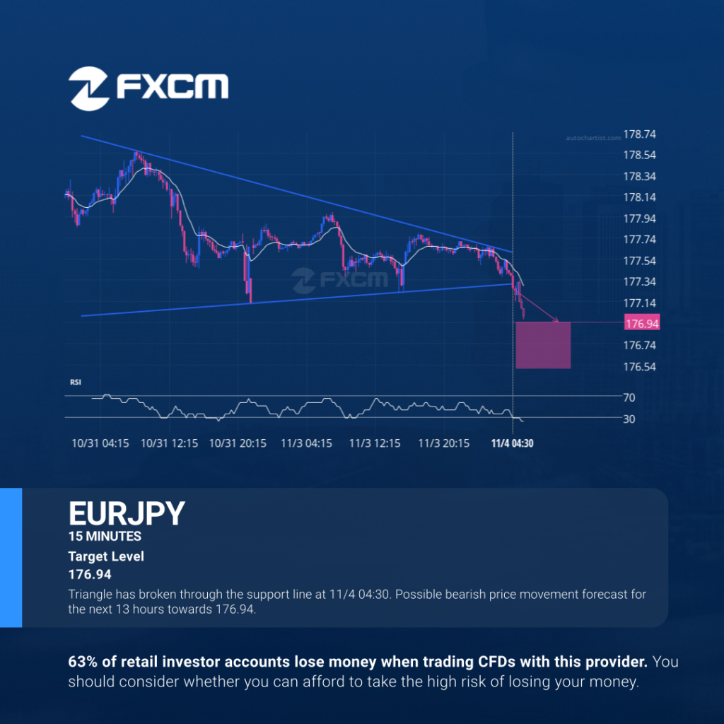 Triangle has broken through the support line at 11/4 04:30. Possible bearish price movement forecast for the next 13 hours towards 176.94. Past performance is not an indicator of future results. Losses can exceed deposits.