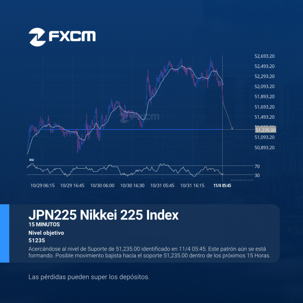 Acercándose al nivel de Suporte de 51,235.00 identificado en 11/4 05:45. Este patrón aún se está formando. Posible movimiento bajista hacia el soporte 51,235.00 dentro de los próximos 15 Horas. El rendimiento pasado no es indicativo de resultados futuros. Las pérdidas pueden exceder los fondos depositados.