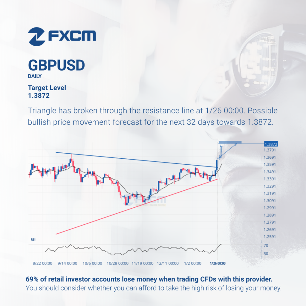 Triangle has broken through the resistance line at 1/26 00:00. Possible bullish price movement forecast for the next 32 days towards 1.3872. Past performance is not an indicator of future results. Losses can exceed deposits.