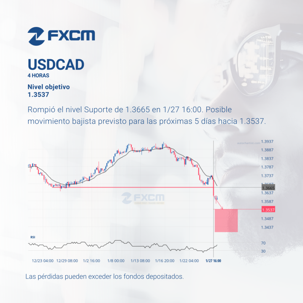 Rompió el nivel Suporte de 1.3665 en 1/27 16:00. Posible movimiento bajista previsto para las próximas 5 días hacia 1.3537. El rendimiento pasado no es indicativo de resultados futuros. Las pérdidas pueden exceder los depósitos.
