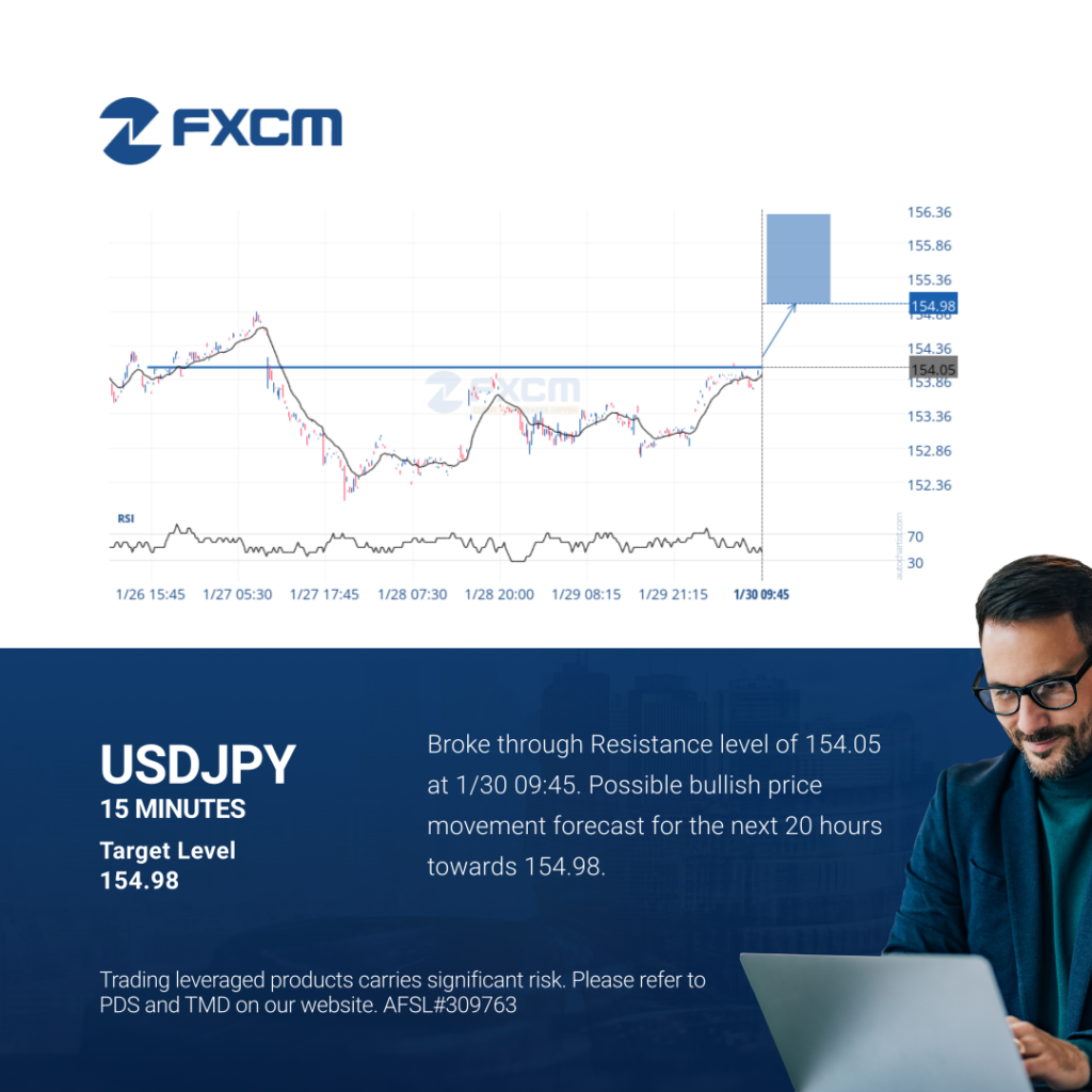 Broke through Resistance level of 154.05 at 1/30 09:45. Possible bullish price movement forecast for the next 20 hours towards 154.98. Past performance is not an indicator of future results. Trading leveraged products carries significant risk. Please refer to PDS and TMD on our website. AFSL#309763