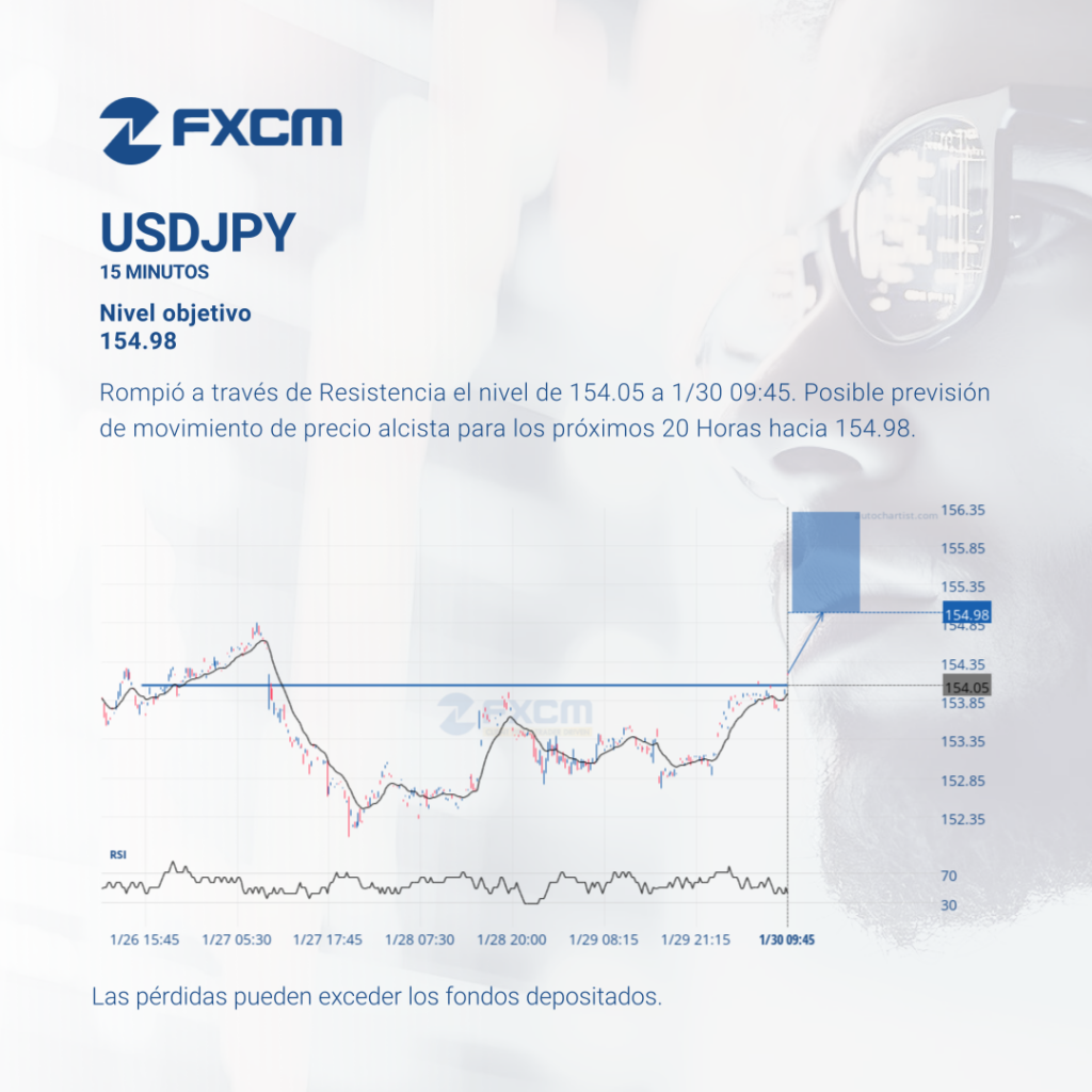 Rompió a través de Resistencia el nivel de 154.05 a 1/30 09:45. Posible previsión de movimiento de precio alcista para los próximos 20 Horas hacia 154.98. Las pérdidas pueden exceder los depósitos.