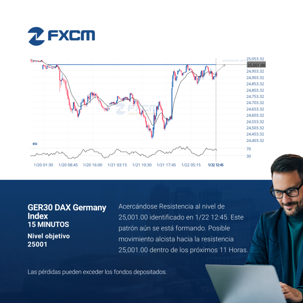Acercándose Resistencia al nivel de 25,001.00 identificado en 1/22 12:45. Este patrón aún se está formando. Posible movimiento alcista hacia la resistencia 25,001.00 dentro de los próximos 11 Horas. El rendimiento pasado no es indicativo de resultados futuros. Las pérdidas pueden exceder los depósitos.
