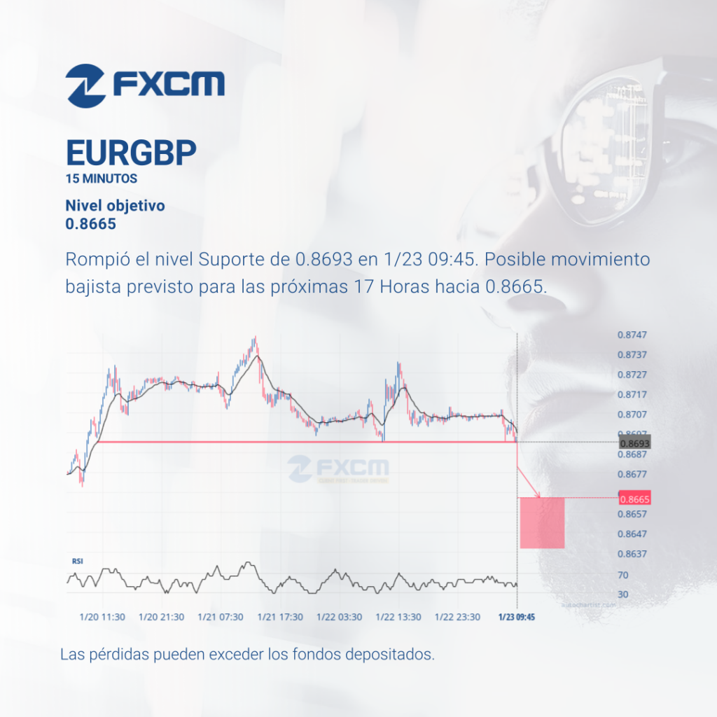 Rompió el nivel Suporte de 0.8693 en 1/23 09:45. Posible movimiento bajista previsto para las próximas 17 Horas hacia 0.8665. Las pérdidas pueden exceder los depósitos.