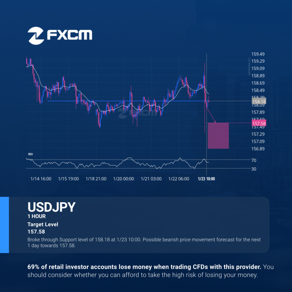 Broke through Support level of 158.18 at 1/23 10:00. Possible bearish price movement forecast for the next 1 day towards 157.58. Past performance is not an indicator of future results. Losses can exceed deposits.