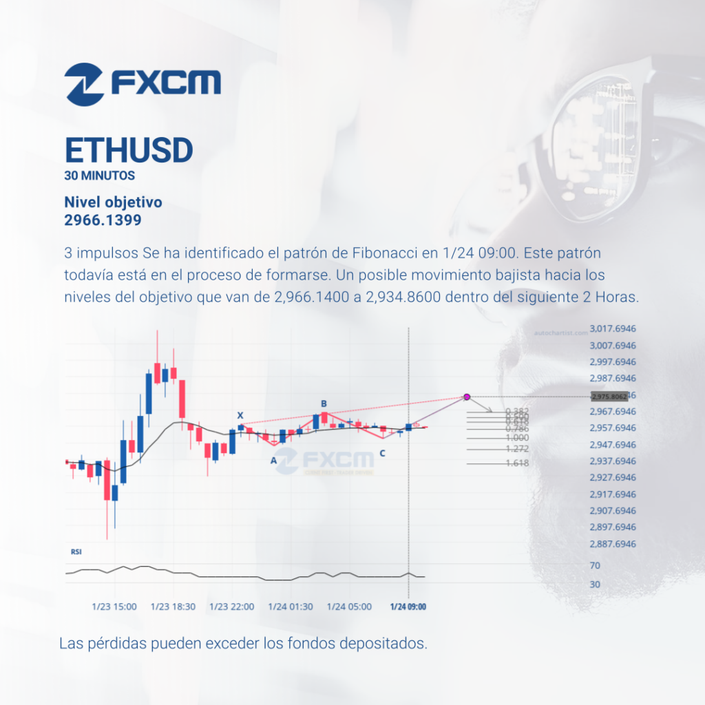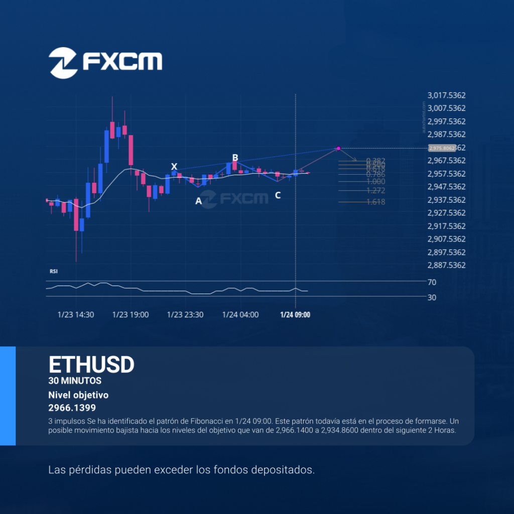 3 impulsos Se ha identificado el patrón de Fibonacci en 1/24 09:00. Este patrón todavía está en el proceso de formarse. Un posible movimiento bajista hacia los niveles del objetivo que van de 2,966.1400 a 2,934.8600 dentro del siguiente 2 Horas. Las pérdidas pueden exceder los depósitos.