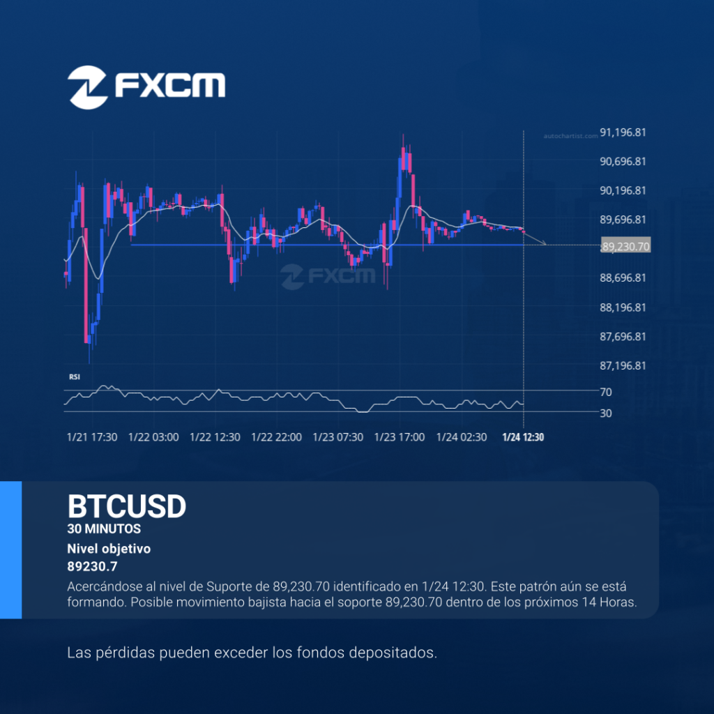 Acercándose al nivel de Suporte de 89,230.70 identificado en 1/24 12:30. Este patrón aún se está formando. Posible movimiento bajista hacia el soporte 89,230.70 dentro de los próximos 14 Horas. Las pérdidas pueden exceder los depósitos.