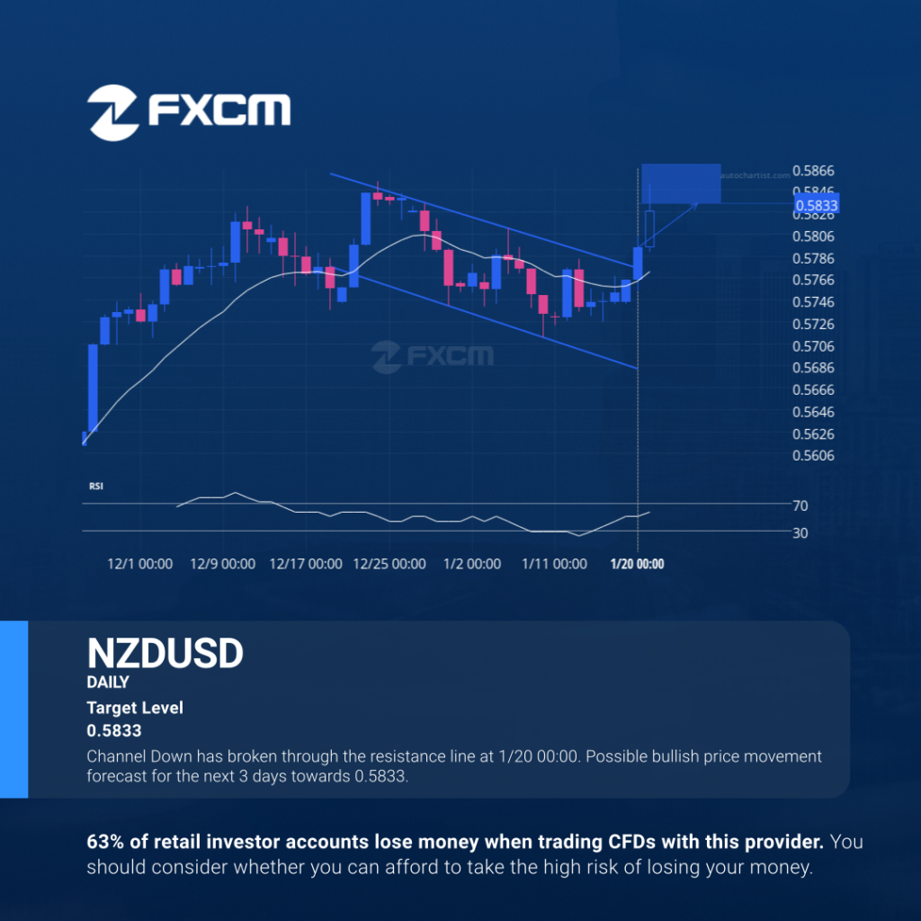 Channel Down has broken through the resistance line at 1/20 00:00. Possible bullish price movement forecast for the next 3 days towards 0.5833. Past performance is not an indicator of future results. Losses can exceed deposits.