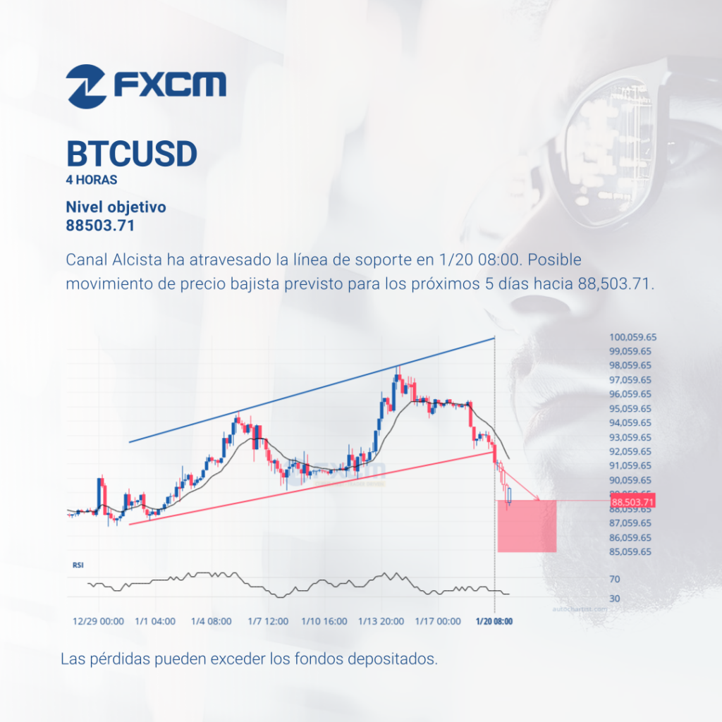 Canal Alcista ha atravesado la línea de soporte en 1/20 08:00. Posible movimiento de precio bajista previsto para los próximos 5 días hacia 88,503.71. El rendimiento pasado no es indicativo de resultados futuros. Las pérdidas pueden exceder los depósitos.