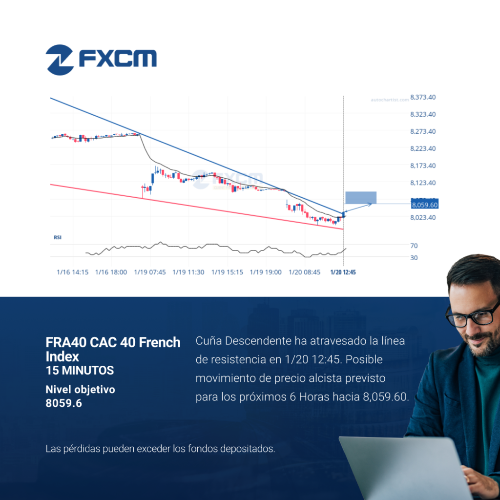 Cuña Descendente ha atravesado la línea de resistencia en 1/20 12:45. Posible movimiento de precio alcista previsto para los próximos 6 Horas hacia 8,059.60. El rendimiento pasado no es indicativo de resultados futuros. Las pérdidas pueden exceder los depósitos.