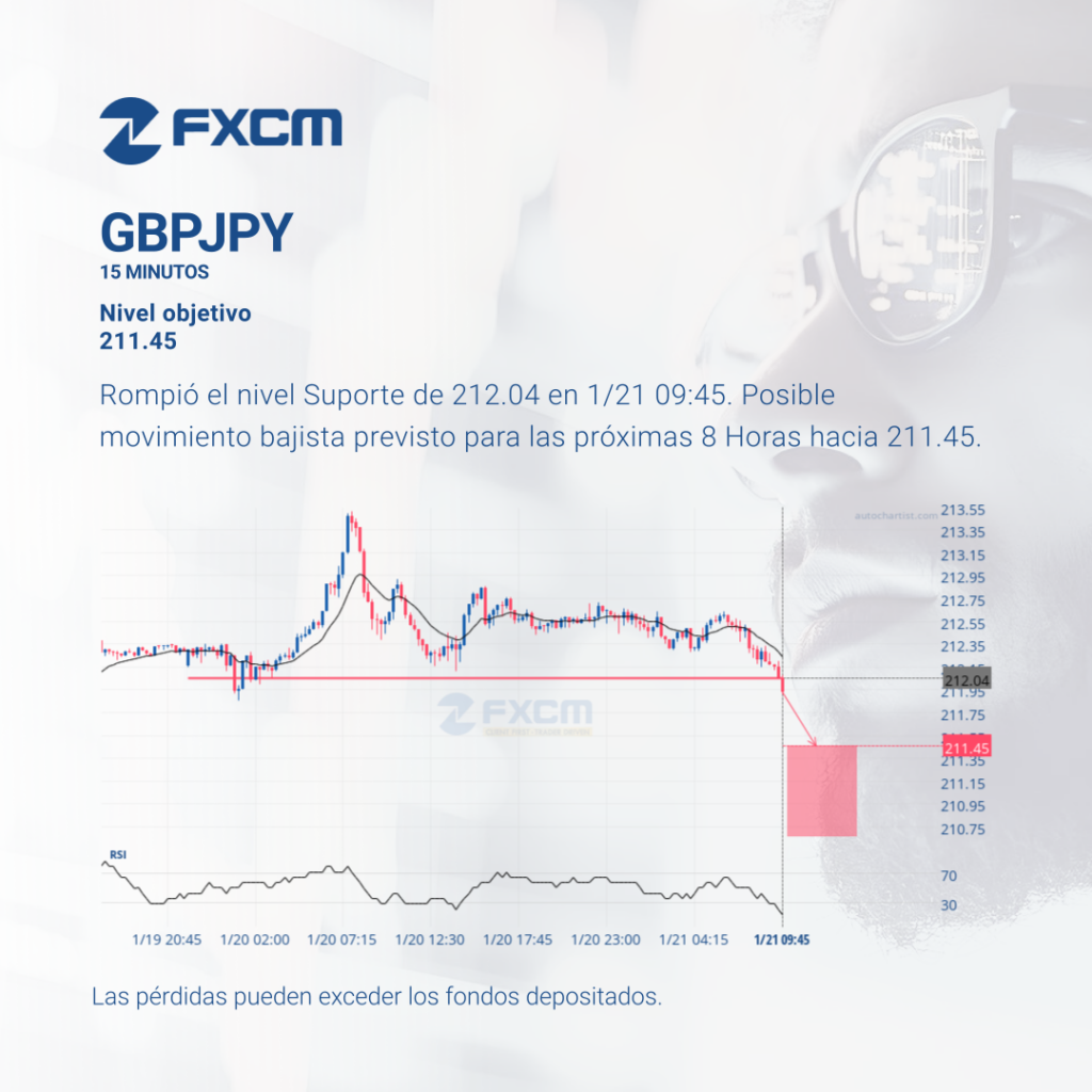 Rompió el nivel Suporte de 212.04 en 1/21 09:45. Posible movimiento bajista previsto para las próximas 8 Horas hacia 211.45. Las pérdidas pueden exceder los depósitos.