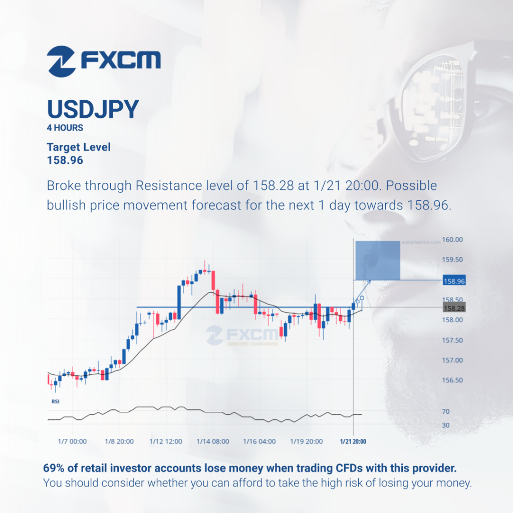 Broke through Resistance level of 158.28 at 1/21 20:00. Possible bullish price movement forecast for the next 1 day towards 158.96. Past performance is not an indicator of future results. Losses can exceed deposits.