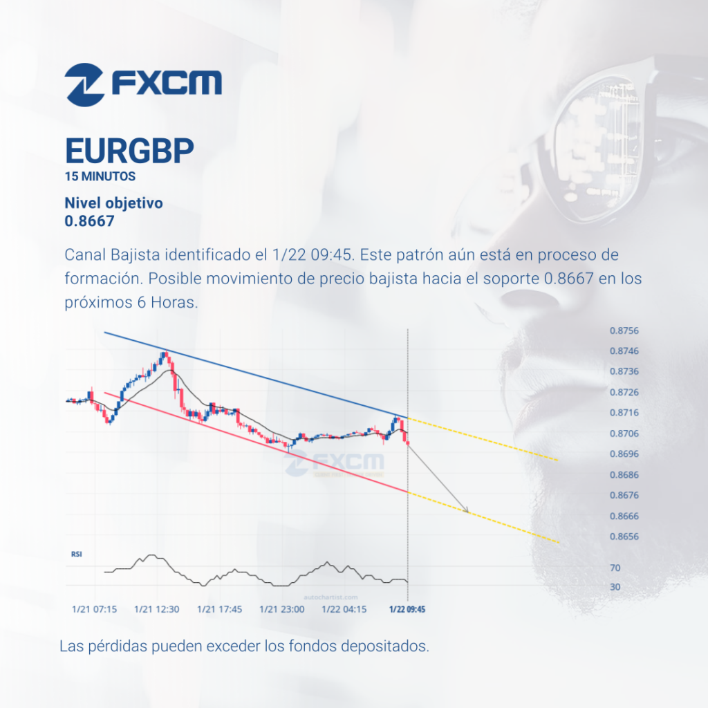 Canal Bajista identificado el 1/22 09:45. Este patrón aún está en proceso de formación. Posible movimiento de precio bajista hacia el soporte 0.8667 en los próximos 6 Horas. Las pérdidas pueden exceder los depósitos.