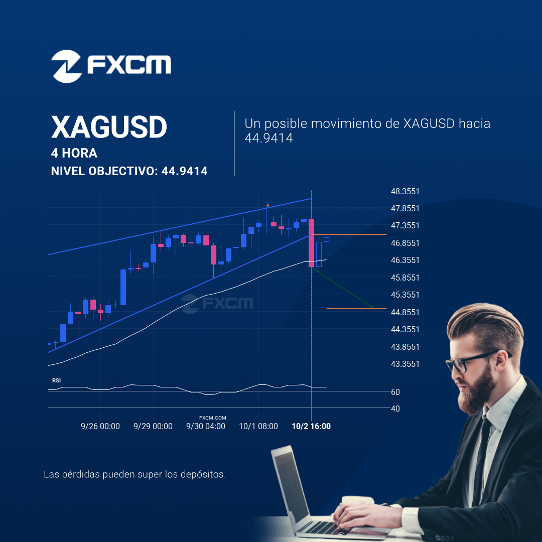 XAGUSD atravesó la línea de soporte de un patrón de Cuña ascendente en 47.074785 en el gráfico de 4 Hora. Esta línea se ha testeado varias veces en el pasado y esta rotura podría significar un próximo cambio de la tendencia actual. Puede continuar en su dirección actual hacia 44.9414.