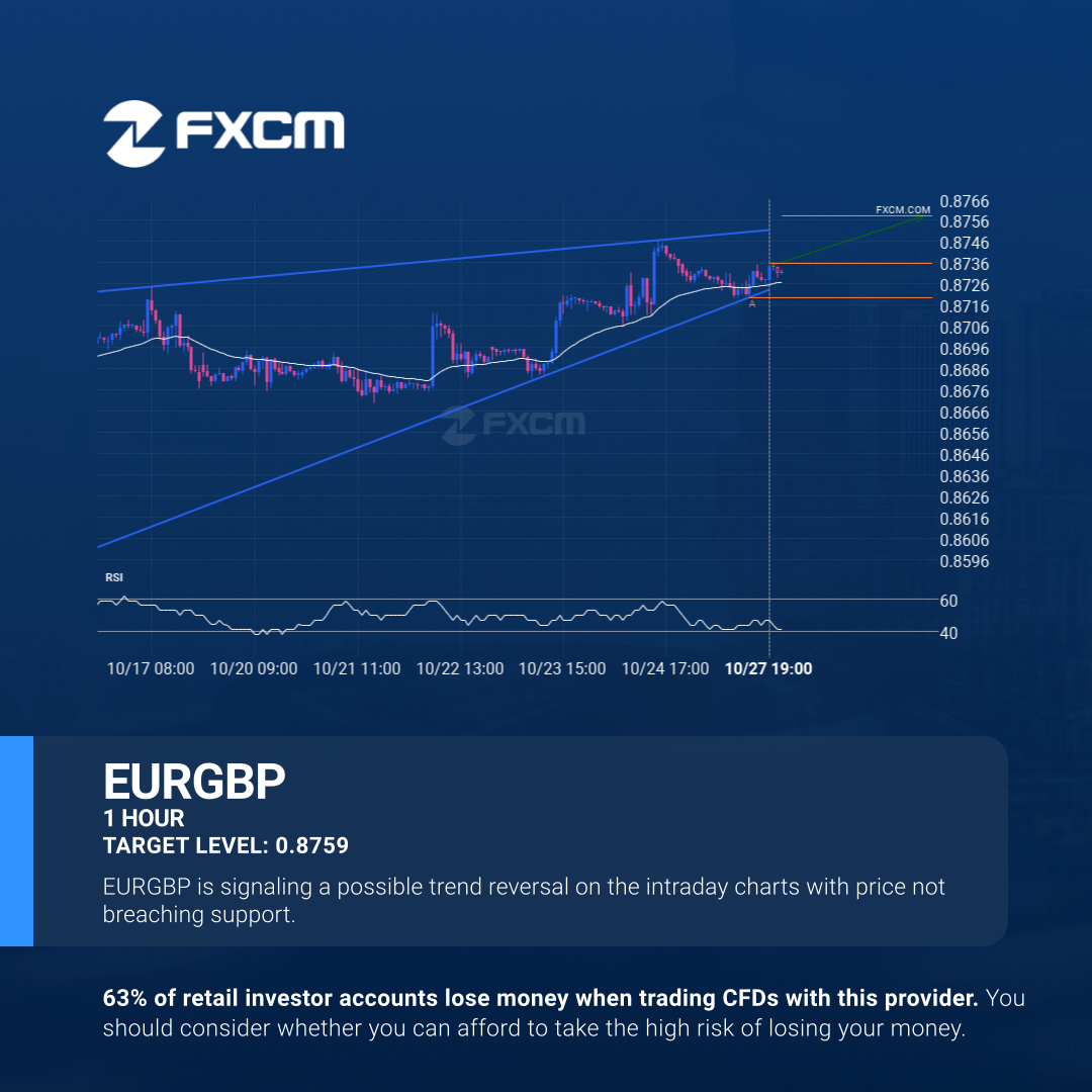 EURGBP is moving towards a resistance line. Because we have seen it retrace from this line before, we could see either a break through this line, or a rebound back to current levels. It has touched this line numerous times in the last 12 days and may test it again within the next 3 days.