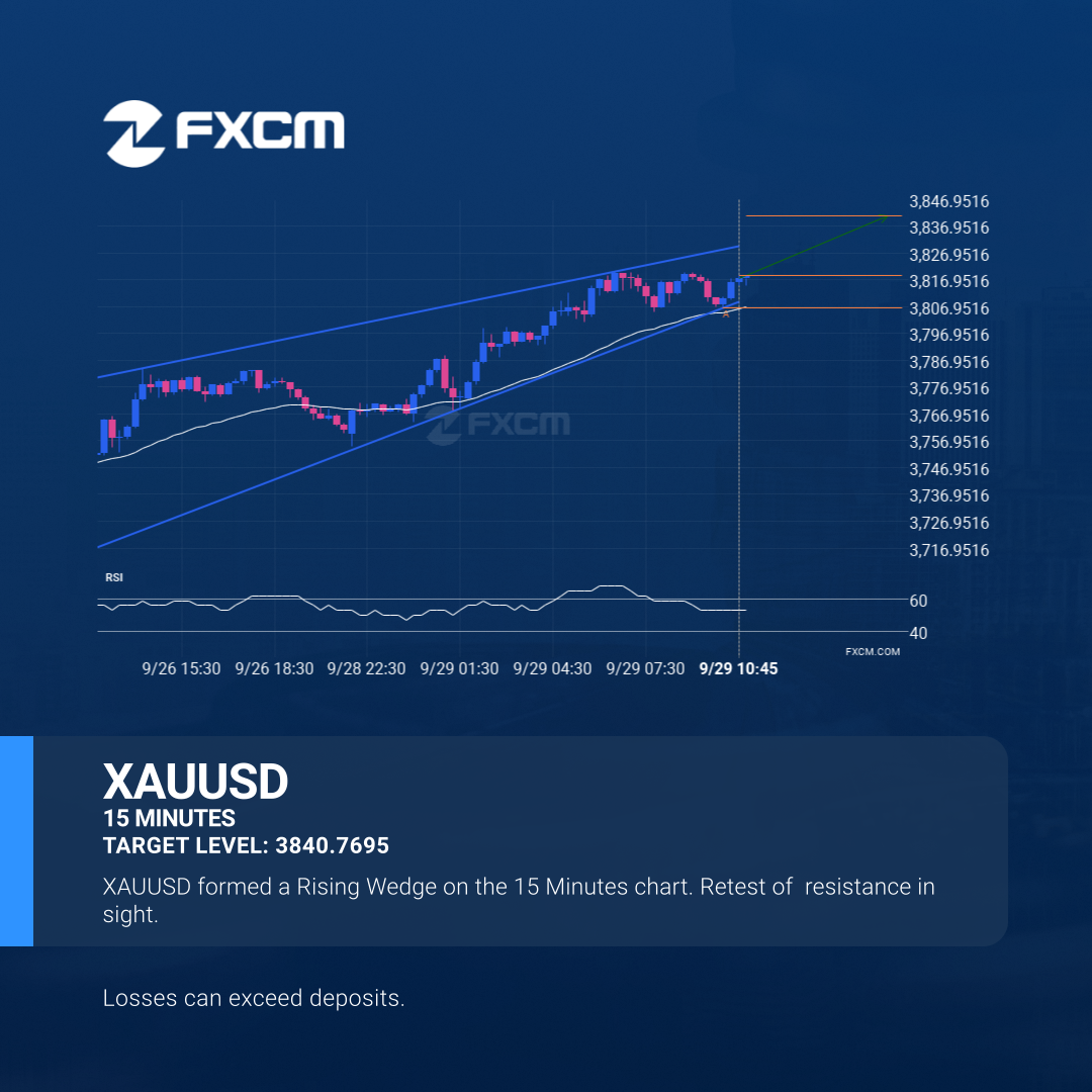 XAUUSD was identified at around 3818.575 having recently rebounded of the support on the 15 Minutes data interval. Ultimately, the price action of the stock has formed a Rising Wedge pattern. This squeeze may increases the chances of a strong breakout. The projected movement will potentially take the price to around the 3840.7695 level.
