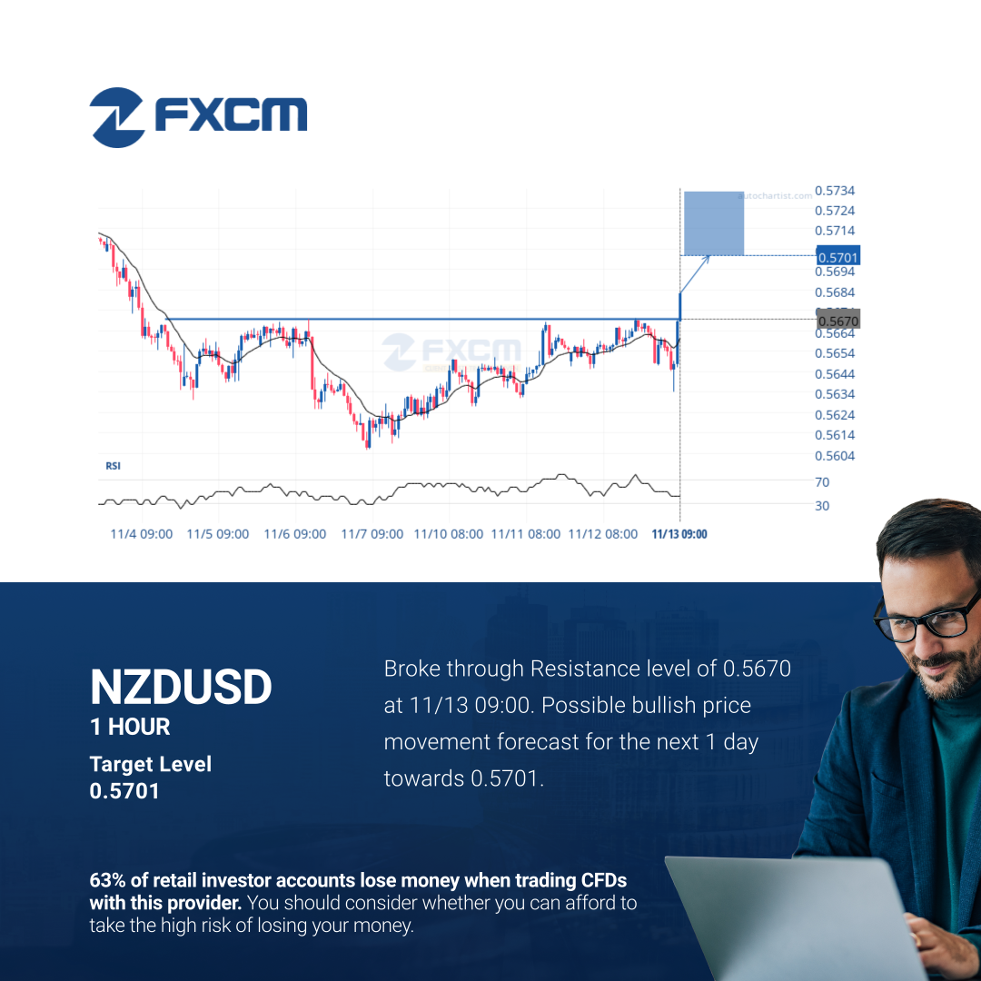 Broke through Resistance level of 0.5670 at 11/13 09:00. Possible bullish price movement forecast for the next 1 day towards 0.5701.