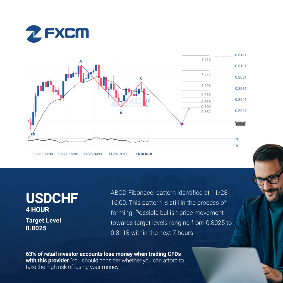 ABCD Fibonacci pattern identified at 11/28 16:00. This pattern is still in the process of forming. Possible bullish price movement towards target levels ranging from 0.8025 to 0.8118 within the next 7 hours.