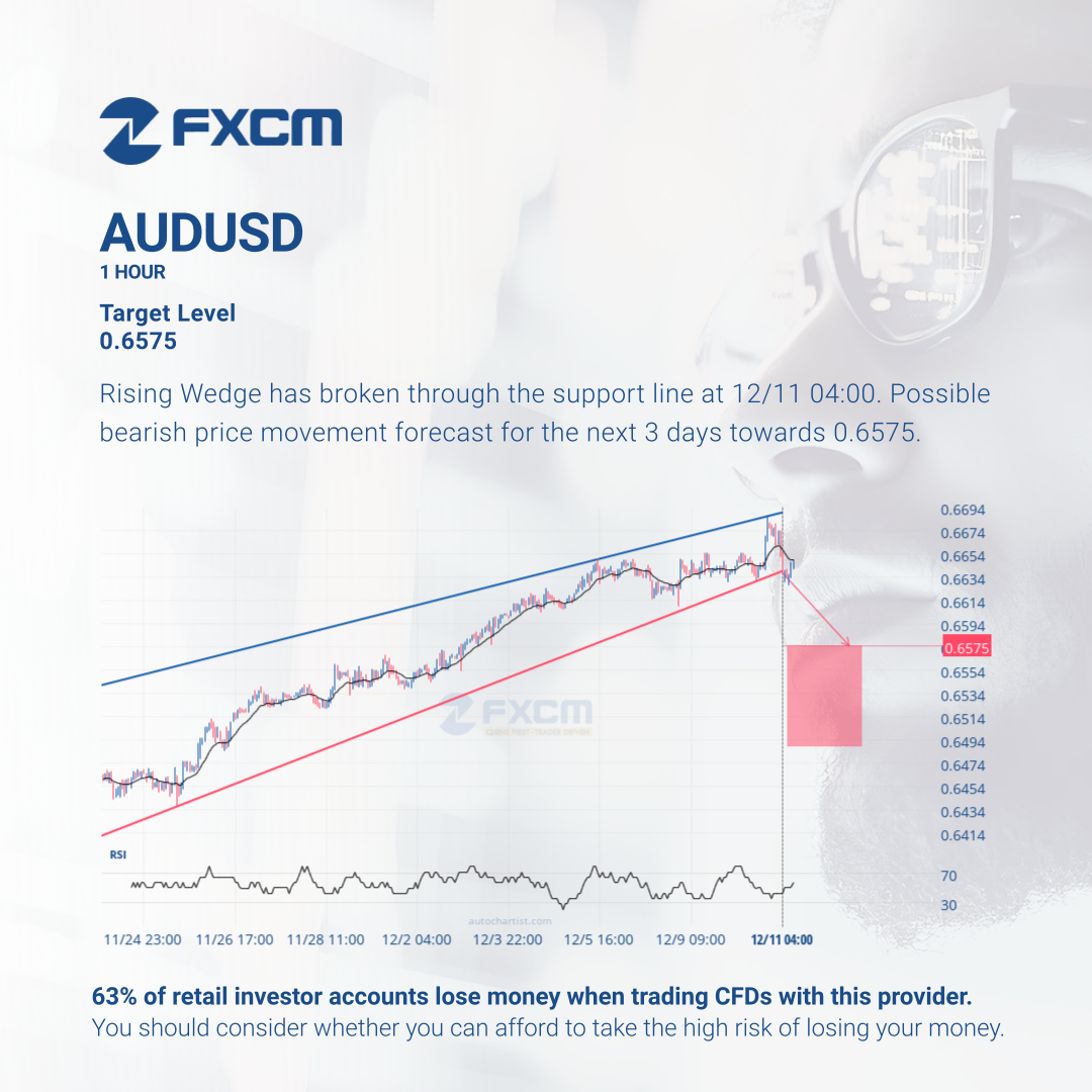 Rising Wedge has broken through the support line at 12/11 04:00. Possible bearish price movement forecast for the next 3 days towards 0.6575.