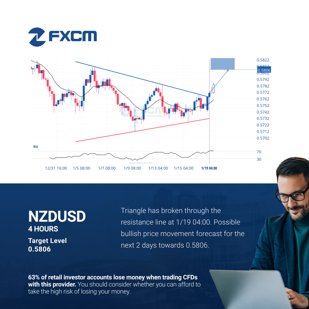 Triangle has broken through the resistance line at 1/19 04:00. Possible bullish price movement forecast for the next 2 days towards 0.5806.