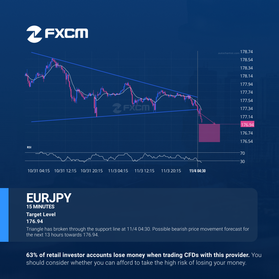 Triangle has broken through the support line at 11/4 04:30. Possible bearish price movement forecast for the next 13 hours towards 176.94.