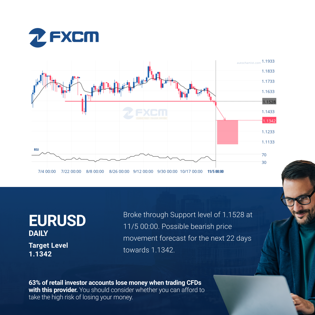 Broke through Support level of 1.1528 at 11/5 00:00. Possible bearish price movement forecast for the next 22 days towards 1.1342.