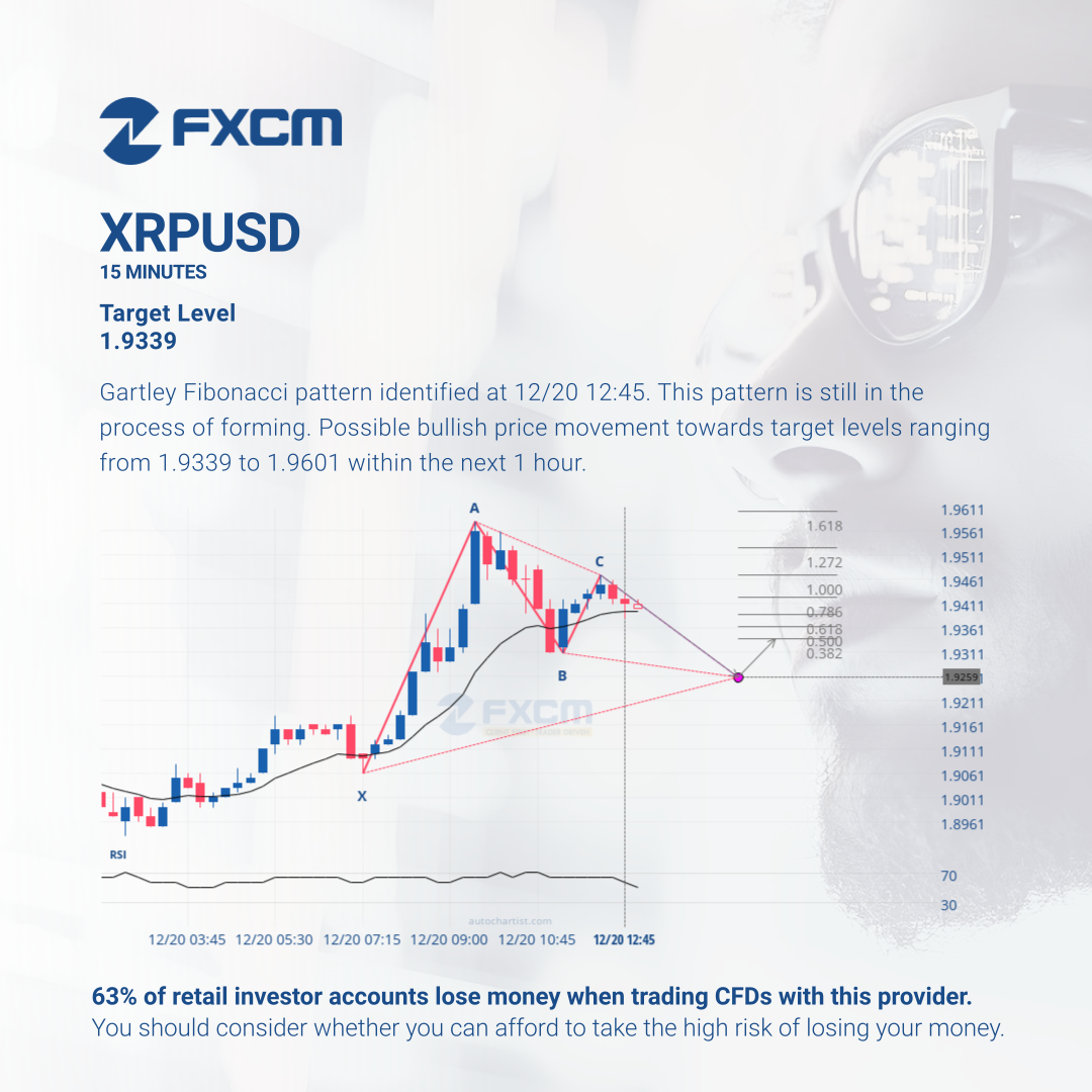Gartley Fibonacci pattern identified at 12/20 12:45. This pattern is still in the process of forming. Possible bullish price movement towards target levels ranging from 1.9339 to 1.9601 within the next 1 hour.
