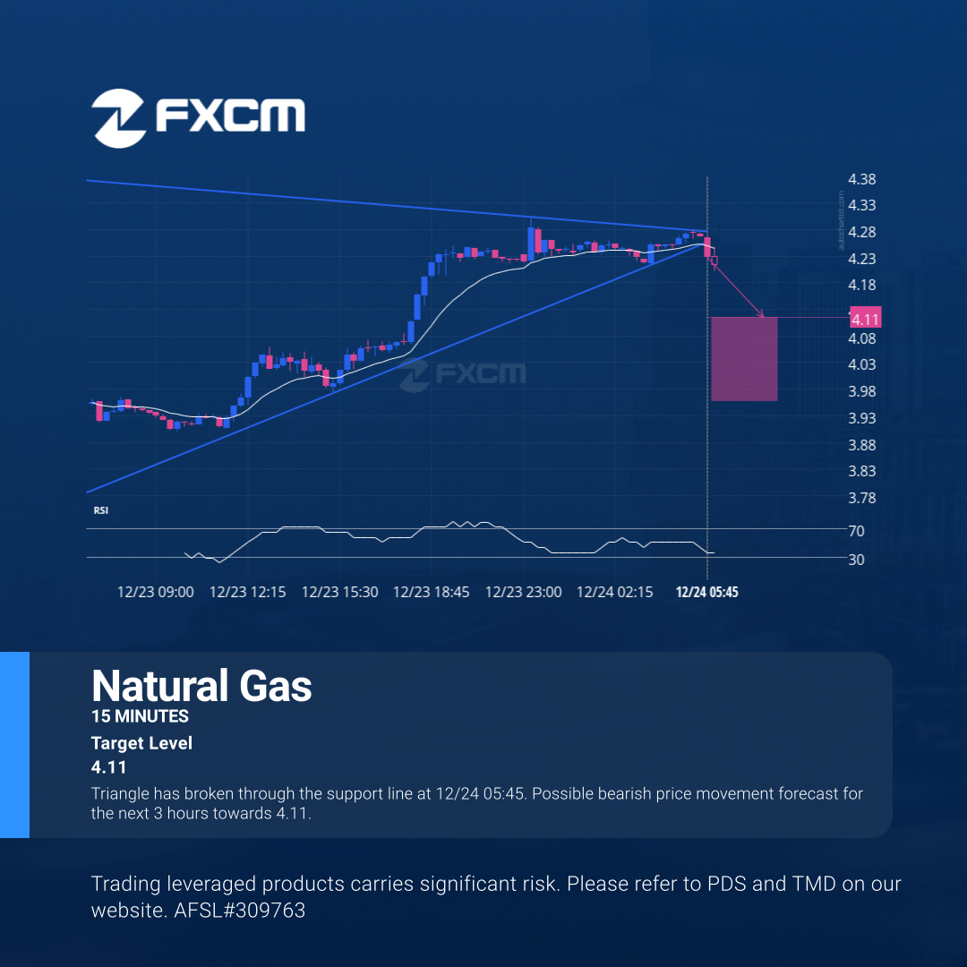 Triangle has broken through the support line at 12/24 05:45. Possible bearish price movement forecast for the next 3 hours towards 4.11.