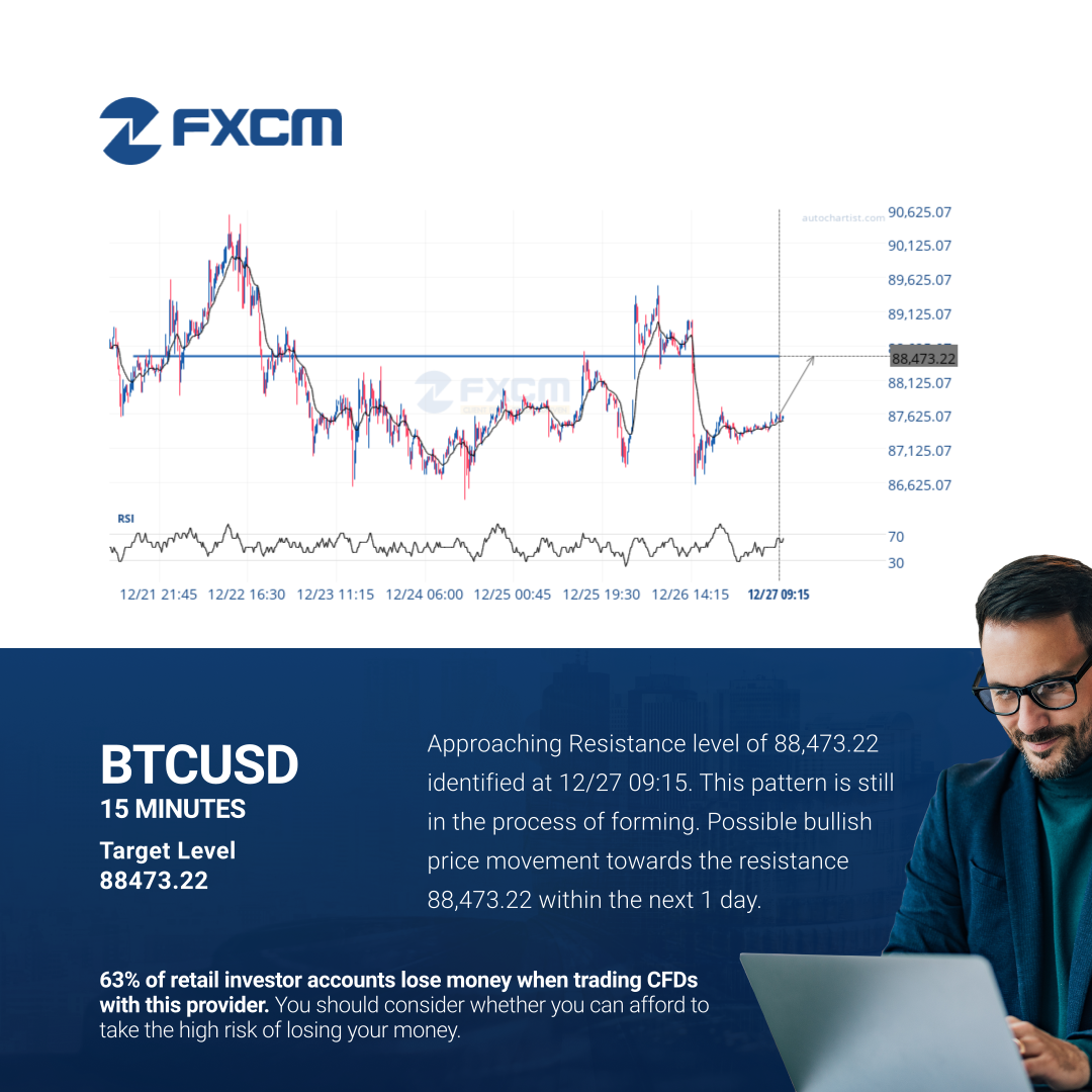 Approaching Resistance level of 88,473.22 identified at 12/27 09:15. This pattern is still in the process of forming. Possible bullish price movement towards the resistance 88,473.22 within the next 1 day.