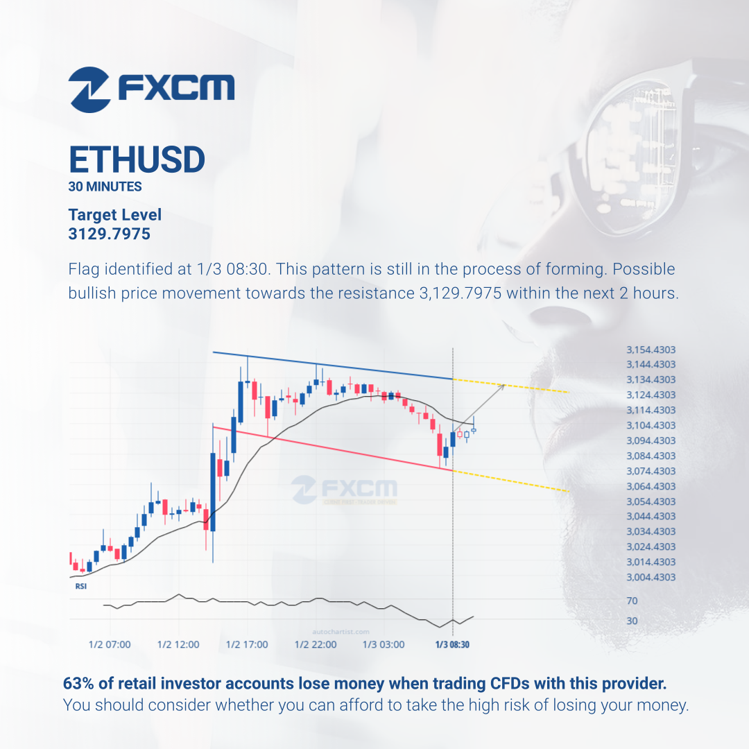 Flag identified at 1/3 08:30. This pattern is still in the process of forming. Possible bullish price movement towards the resistance 3,129.7975 within the next 2 hours.