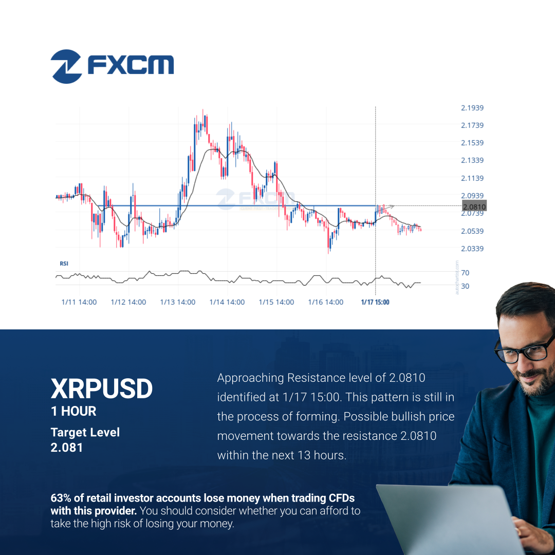 Approaching Resistance level of 2.0810 identified at 1/17 15:00. This pattern is still in the process of forming. Possible bullish price movement towards the resistance 2.0810 within the next 13 hours.