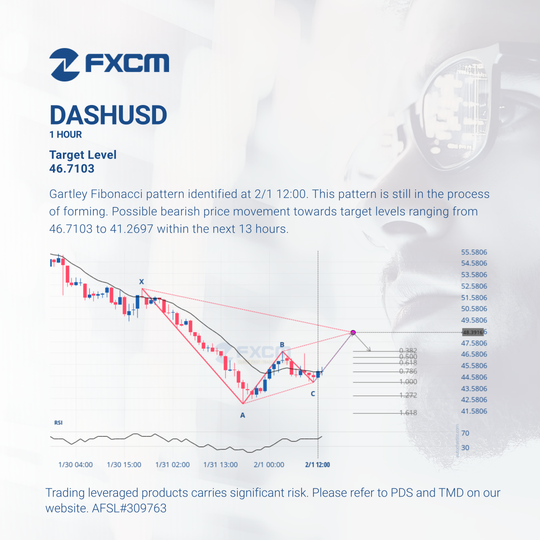 Gartley Fibonacci pattern identified at 2/1 12:00. This pattern is still in the process of forming. Possible bearish price movement towards target levels ranging from 46.7103 to 41.2697 within the next 13 hours.