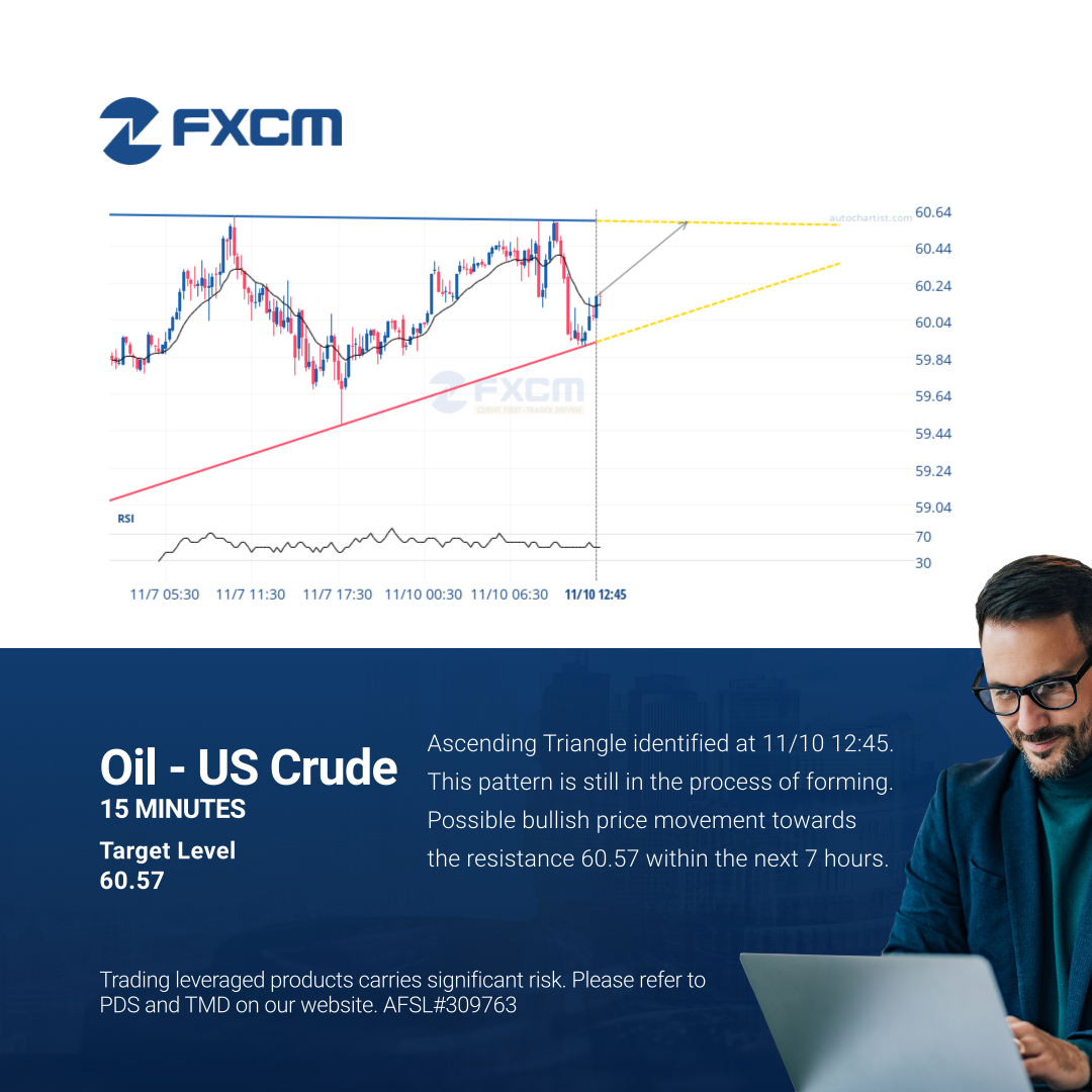 Ascending Triangle identified at 11/10 12:45. This pattern is still in the process of forming. Possible bullish price movement towards the resistance 60.57 within the next 7 hours.