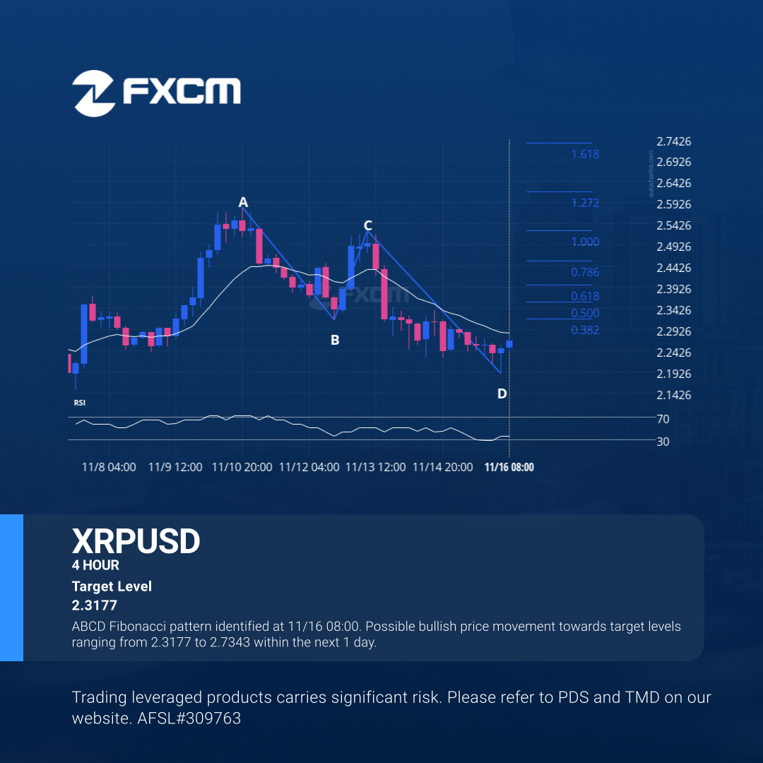 ABCD Fibonacci pattern identified at 11/16 08:00. Possible bullish price movement towards target levels ranging from 2.3177 to 2.7343 within the next 1 day.