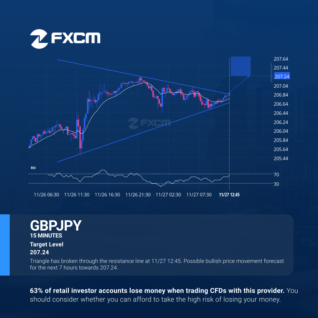 Triangle has broken through the resistance line at 11/27 12:45. Possible bullish price movement forecast for the next 7 hours towards 207.24.