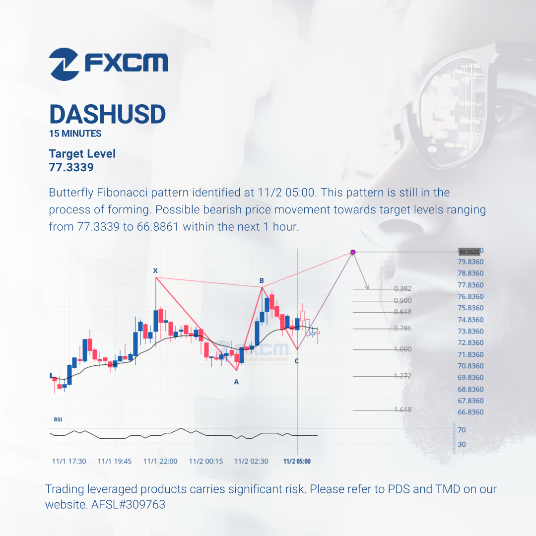 Butterfly Fibonacci pattern identified at 11/2 05:00. This pattern is still in the process of forming. Possible bearish price movement towards target levels ranging from 77.3339 to 66.8861 within the next 1 hour.