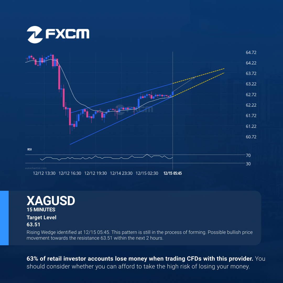 Rising Wedge identified at 12/15 05:45. This pattern is still in the process of forming. Possible bullish price movement towards the resistance 63.51 within the next 2 hours.