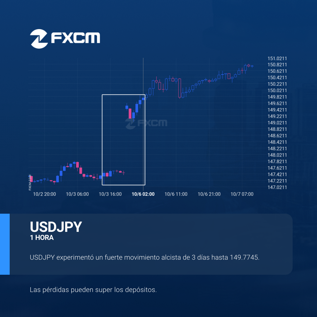 USDJPY se ha movido al alza un 1,58% desde 147.4485 hasta 149.7745 en los últimos 3 días.